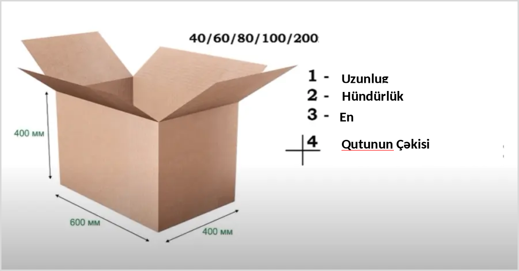 Misal: 54*36*40 [70↑]. Bu o deməkdir ki, təklif olunan məhsuldan 70 ədədə qədər bu ölçüdə qutuya qablaşdırıla bilər.